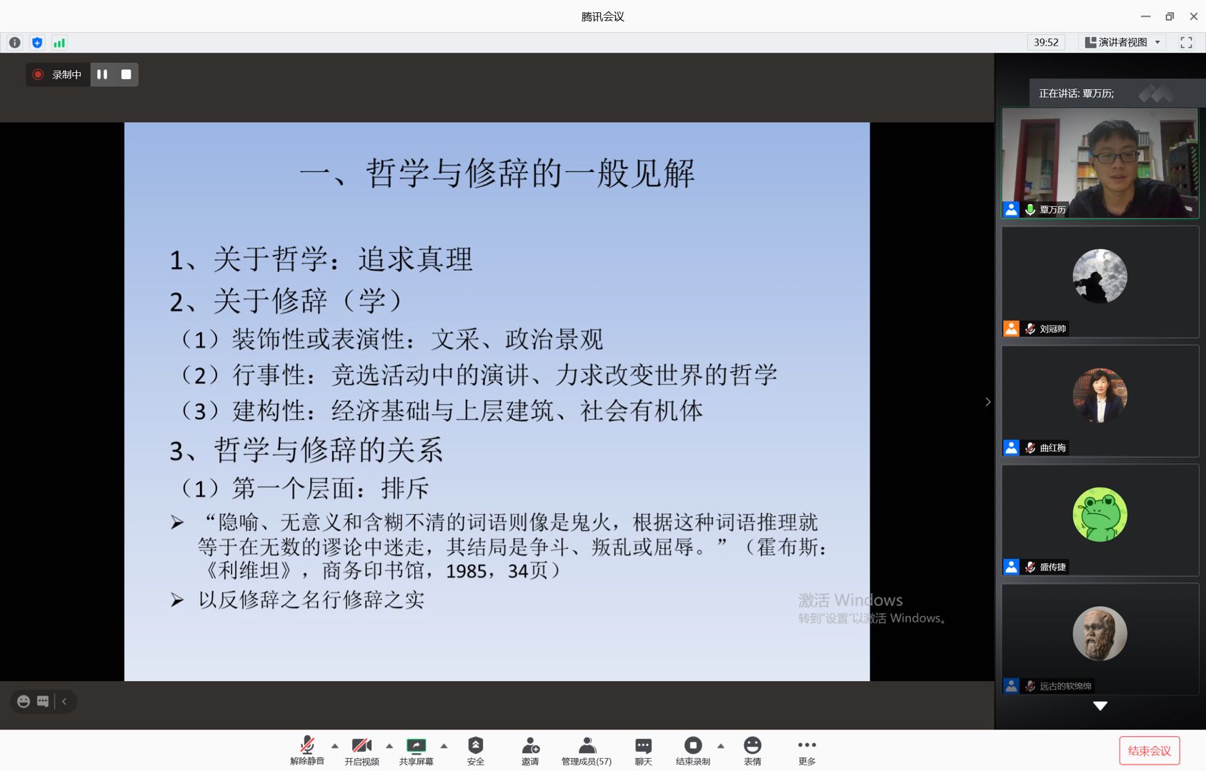 覃万历博士从“哲学与修辞的一般见解”“柏拉图与问题的凸显”“哲学如何激发行动”“哲学如何建构”等几个方面,深入、系统地阐述了如何用修辞进行哲学思考。