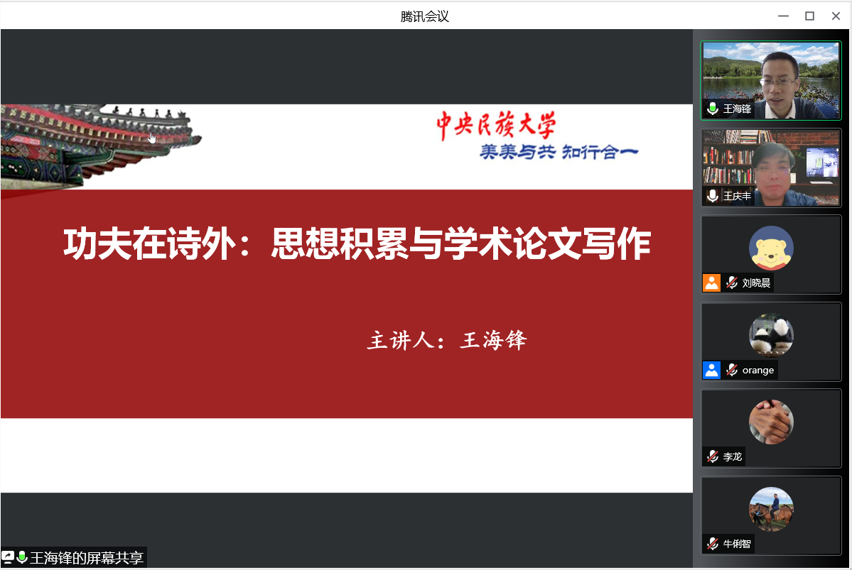 2022年4月18日晚,中央民族大学哲学与宗教学公司教授、博士生导师王海锋应邀做BETWAY必威名家系列讲座(第153场)。讲座题为“功夫在诗外:思想积累与学术论文写作”。本次讲座以线上腾讯会议形式举办,由BETWAY必威教授、博士生导师王庆丰教授主持。