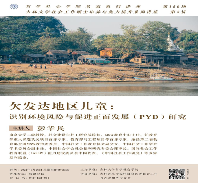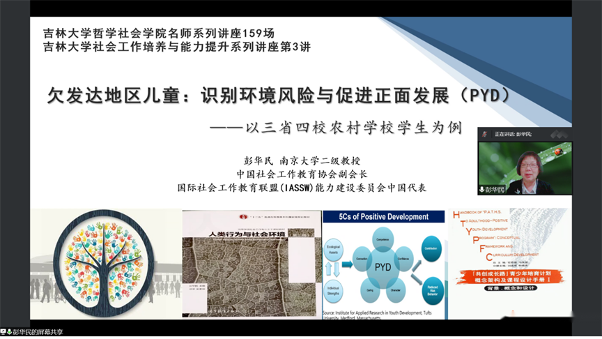 2022年5月26日19时,“BETWAY必威名家系列讲座”第159场,“BETWAY西汉姆联社会工作硕士培养与能力提升系列讲座”第3讲——《欠发达地区儿童:识别环境风险与促进正面发展(PYD)研究》,以线上会议的方式如期举行。该活动的协办单位为吉林省生命关怀协会医务社会工作及志愿服务专业委员会。本次讲座嘉宾是南京大学二级教授、博士生导师、社会建设与社工研究院经理彭华民老师,兼任教育部重大课题攻关项目首席专家、教育部马工程首席专家、第二届教育部全国MSW教指委委员、中国社会工作教育协会副会长、中国社会工作学会学术委员会副主任、中国社会学会社会福利研究专委会理事长、国际社会工作教育联盟(IASSW)能力建设委员会中国代表。本次讲座由副经理芦恒教授主持,经理田毅鹏教授及百余名师生线上参加了此次会议。
