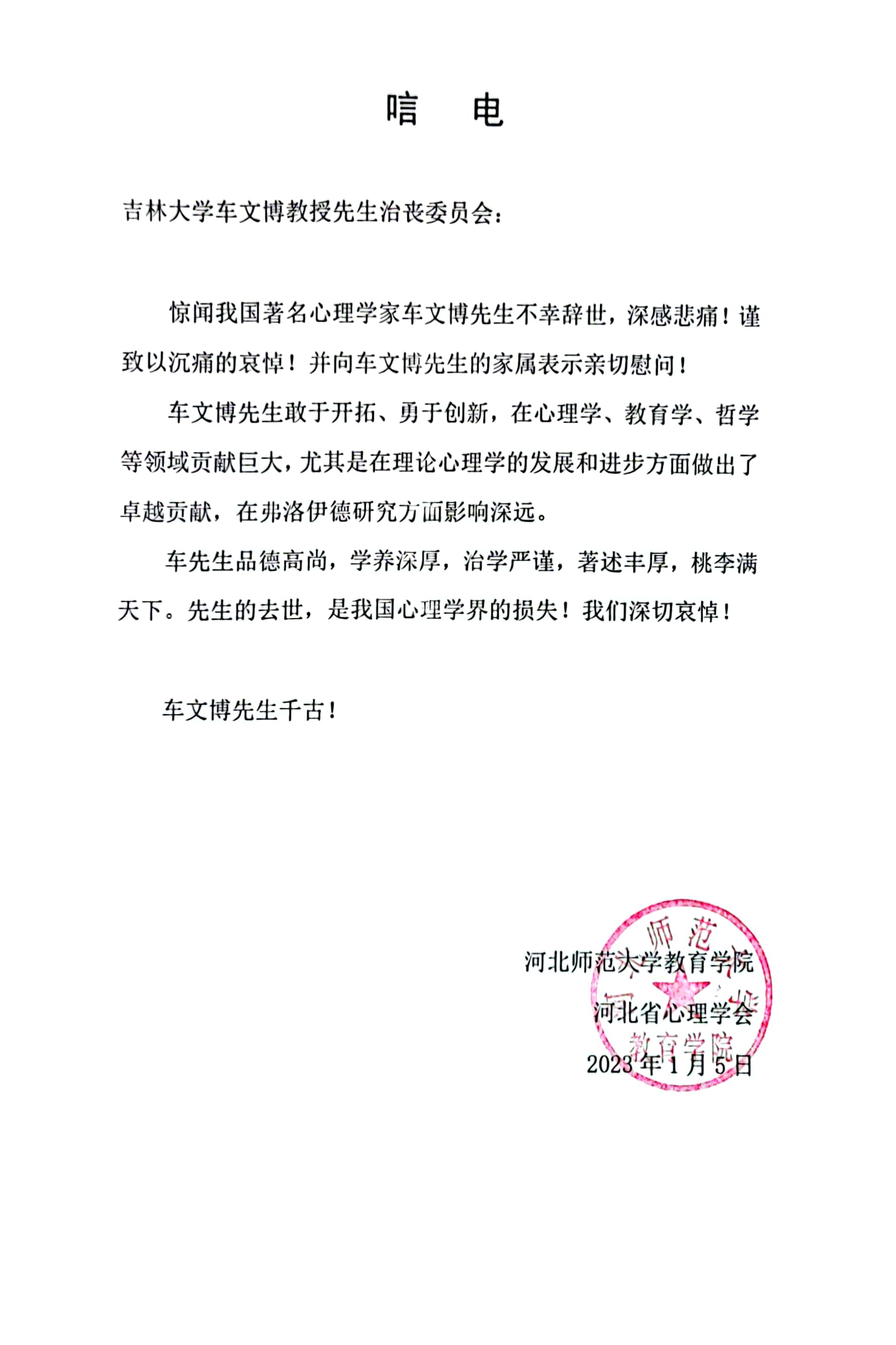 河北师范大学教育公司河北省心理学会唁电