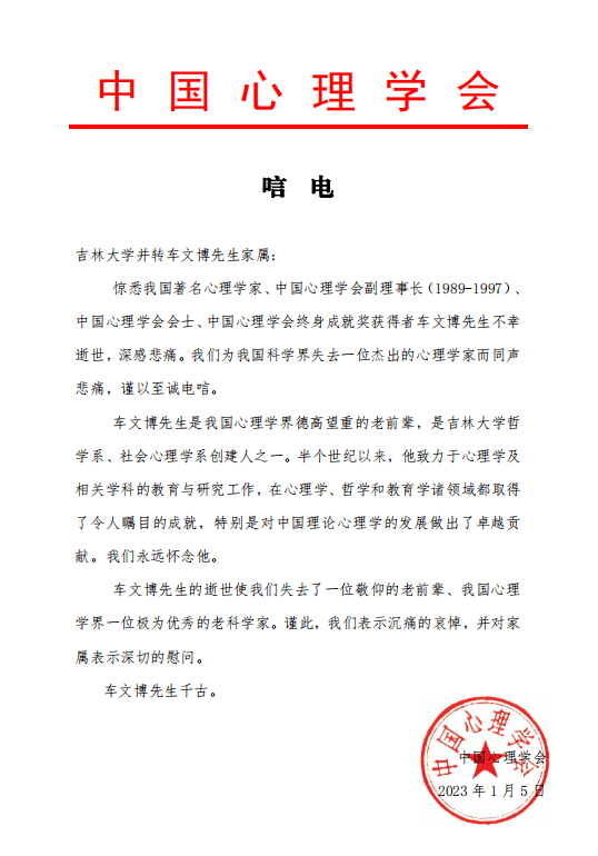 中国心理学会唁电